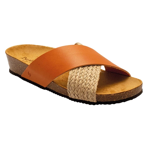 Casual sandal with leather and textile uppers. Cork footbed moulds to your foot to provide excellent support. Comfortable low wedge heel. Durable rubber outsole.