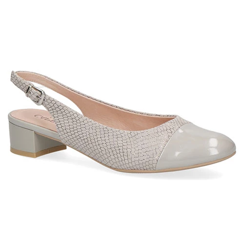 Sling back, low heeled court shoe with soft leather uppers and linings. Supportive buckle strap provides adjustment. Durable and flexible rubber outsole.