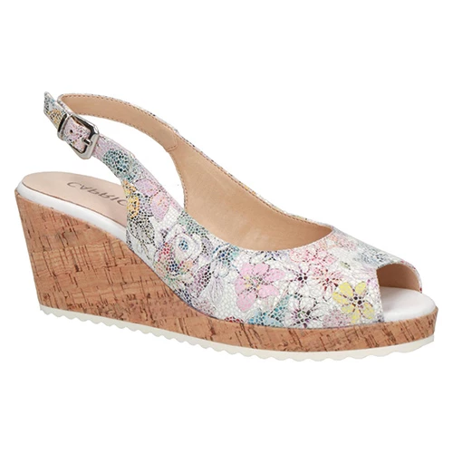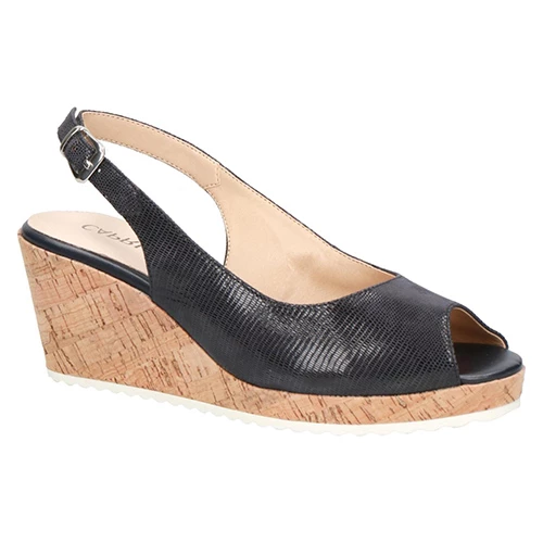 Sling back sandal with a comfortable wedge footbed. Leather uppers and linings provide ultimate comfort with a buckle strap for support and adjustment. Durable and flexible rubber outsole.