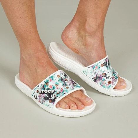 Crocs Slide sandal with vibrant tiedye detail. Original Croslite™ foam cushion will keep you supported all day long. Easy to clean and quick to dry.