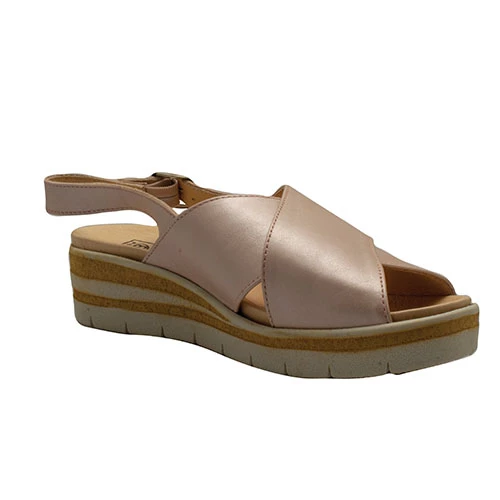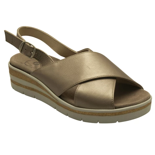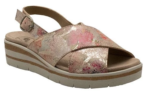 Sculptured wedge sandal with an adjustable back strap for a securer fastening. Soft leather uppers in a cross over pattern provide an easy on fit and offer excellent foot coverage. Lightweight shock absorbent sole features a detachable leather “air cushioined” insole allowing you to use your orthotics if required