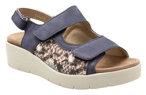 Stylish wedge sandal with leather and reptile print stretch textile uppers.