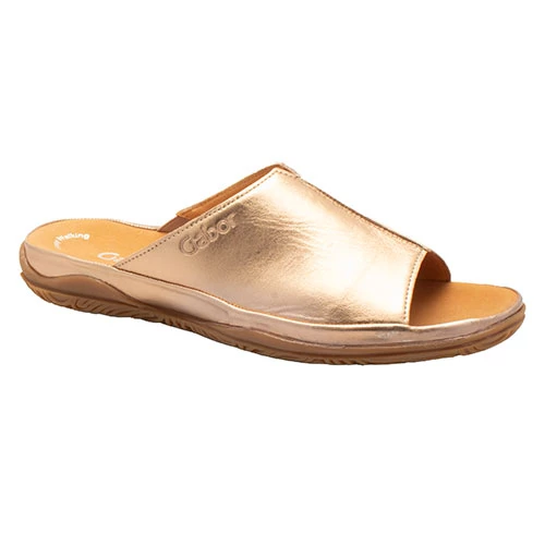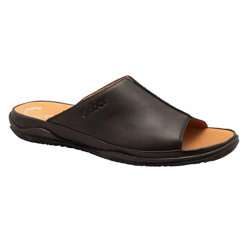 Easy to slide on sandal with soft and flexible uppers and hidden elastic for an easy on fit. Microfibre covered contoured footbed provides luxurious comfort and support. Durable rubber outsole with grip pattern.