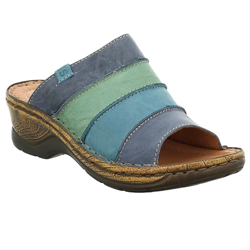 Open toe, mule style sandal with a wedge outsole and vibrant leather uppers. Smooth leather linings and a leather covered cushioned footbed. Wood effect heel alongside a handstitched sole.