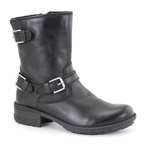 Ladies block heeled biker style waterproof boot featuring a side buckle.
