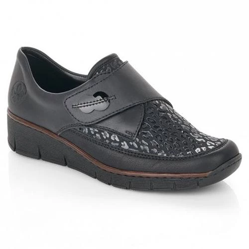 This wedged lightweight loafer has a leather and textile upper with a delicate pattern on the vamp. It boasts an easy slip on and Velcro fastening for easier access. This flexible shoe is bunion friendly and has a cushioned insole.