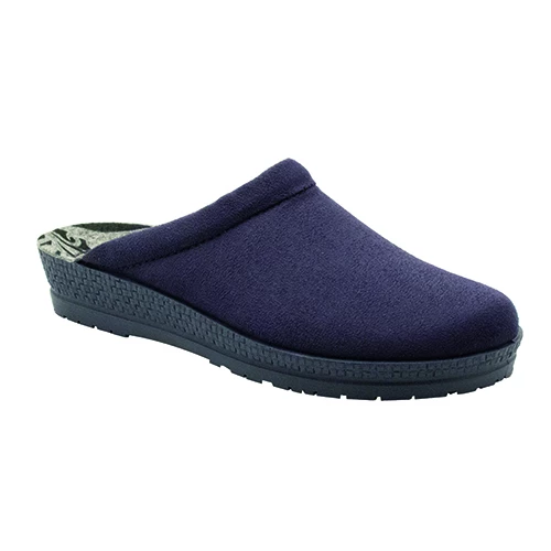 Open back slipper with soft textile uppers and a cushioned footbed.