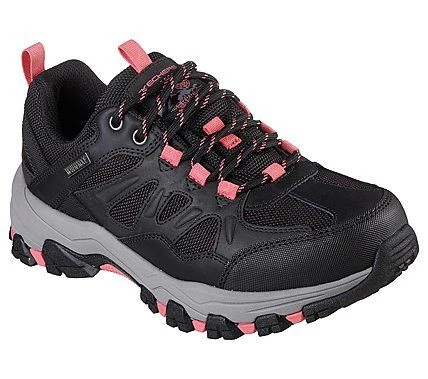 Hiking shoe for women with a durable waterproof leather and mesh fabric upper. Lightly textured durable synthetic overlays at toe and heel. Smooth nylon mesh fabric panels at front, sides and collar for breathable comfort. Waterproof seam sealed design. Lace up front with metal top eyelets. Relaxed Fit® design for roomy comfortable fit. Air Cooled Memory Foam full length cushioned comfort insole. Flexible rubber high traction lug patterned outsole.