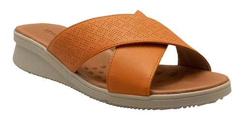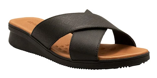 Versatile slide sandal with cross over leather straps and beautiful punch detailing.