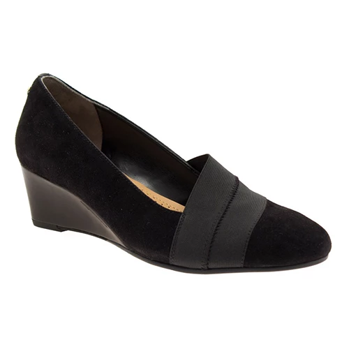 Stylish court with soft suede uppers. Stretch detailing perfectly offsets the suede and also provides an easy entry in the shoe. Leather covered insole with built in padding to the ball of the foot and underneath the heel.