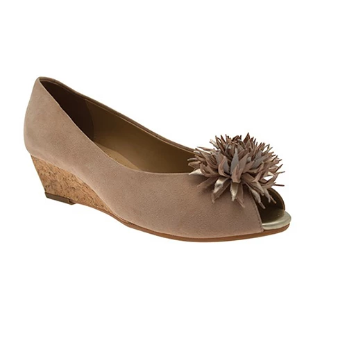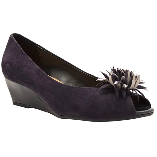 Kingswood is an elegant peep toe court shoe in a wider fitting with soft suede uppers. Soft leather linings and underfoot cushioning make this is a very comfortable shoe to wear. Low wedge heel with stylish cork detail.