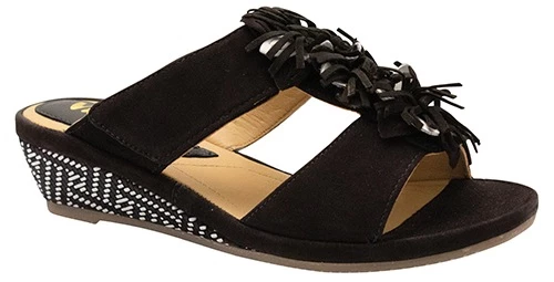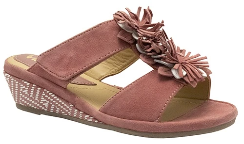 Beautiful low wedge sandal with uppers crafted from supple suede, a decorative trim and stylish parquet pattern around the heel .