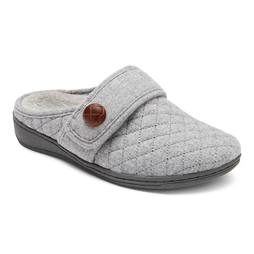 Supportive, open back mule style slipper with soft quilted textile uppers. The Vionic biomechanical orthotic footbed provides support and natural alignment to relieve the pressure on your feet and lower body. Durable rubber outsole.