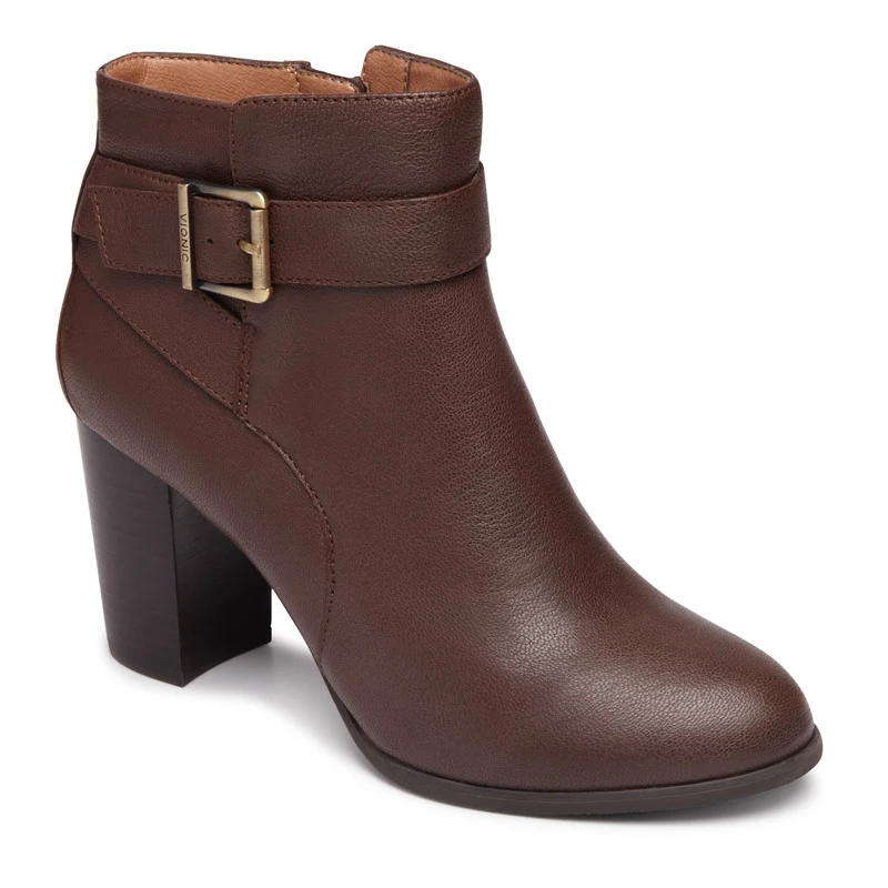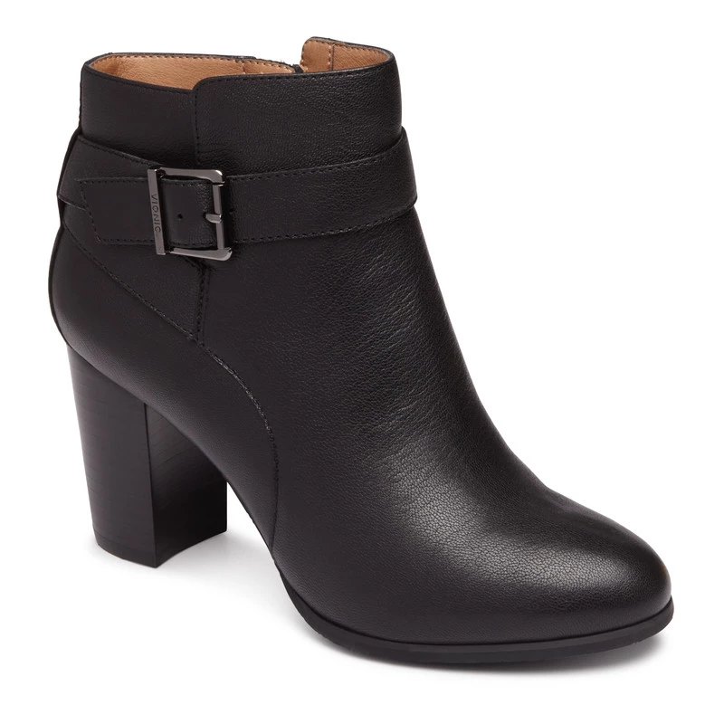 Contemporary ankle boot with water resistant leather uppers. Side zip for easy access. Vionic elevated support offers full contact to support your feet and ball of foot cushioning to provide all day comfort. Lightweight rubber outsole.